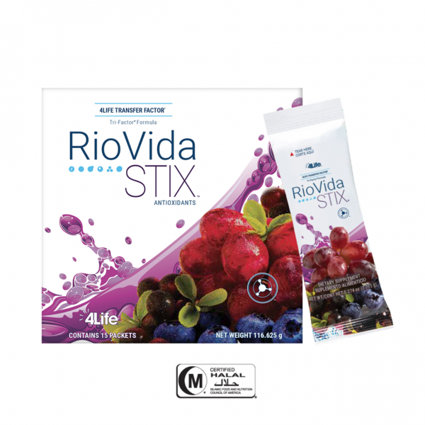 RioVida Stix provides the immune system goodness of 4Life Transfer Factor RioVida Tri-Factor Formula in a portable powder pack. It combines a full serving of 4Life Transfer Factor Tri-Factor Formula (made from cow colostrum and egg yolk) with a rush of antioxidants and phytonutrients from açaí, pomegranate, blueberry, elderberry, purple grape, and apple, plus electrolytes.